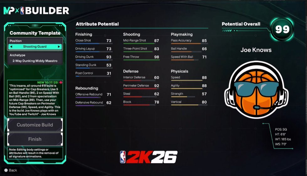 “This insane, all-around 6’8 build is “optimized” for Cap Breakers. Use 5 on Ball Handle (86), 4 on Speed With Ball (80), and 2 from specialization on Mid-Range (88). Then, use your future Cap Breakers on Perimeter Defense (99), Speed, and Agility. This is the build Joe Knows plays with on YouTube and Twitch!” – Joe Knows