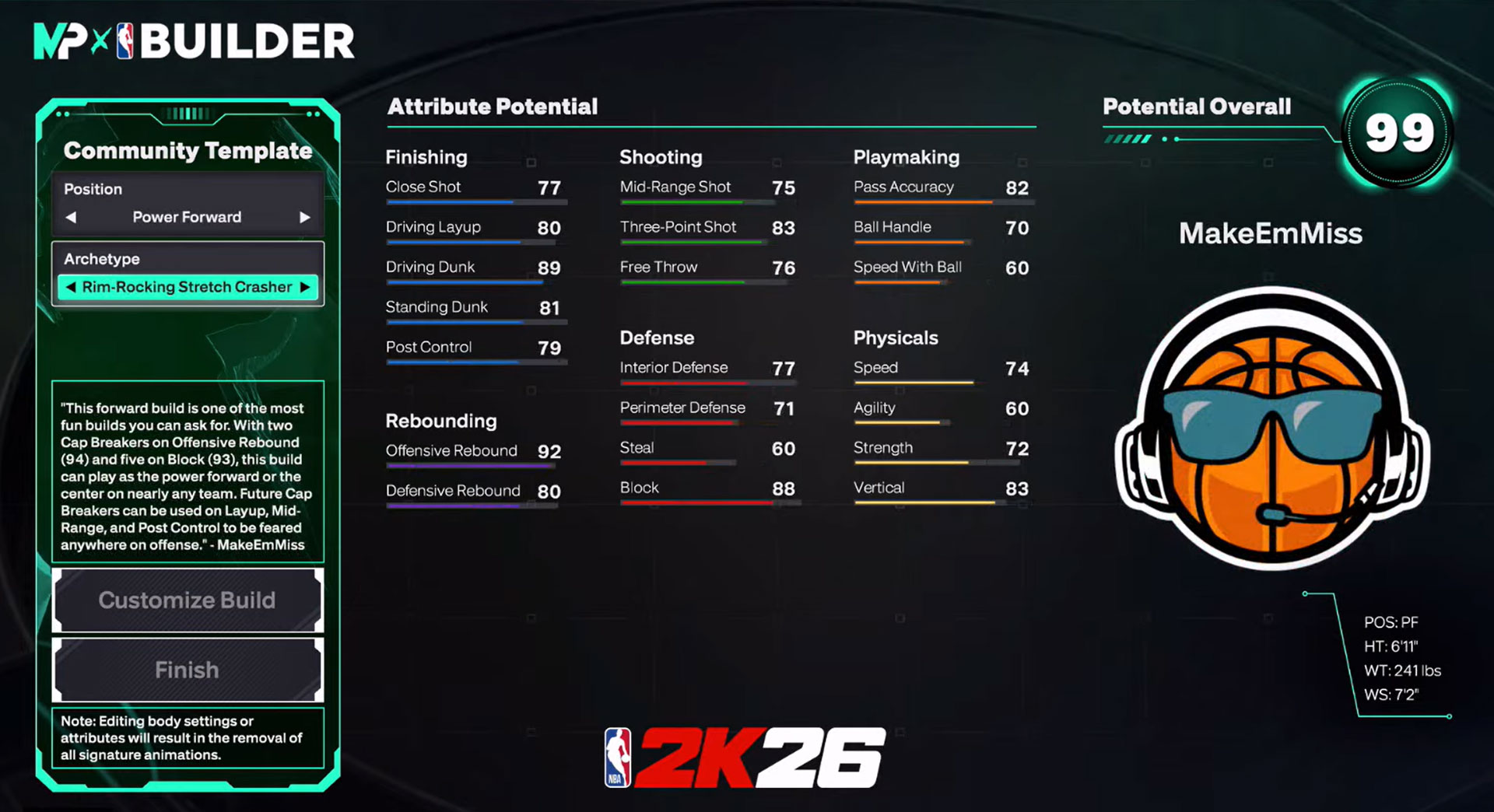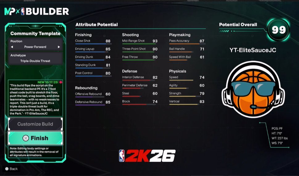 “This build flips the script on the traditional backend PF. It’s a 7 foot cheat code built to stretch the floor, push the ball, snag boards, and dime teammates – with no weaknesses to report. This isn’t just a build, it’s a triple-double threat built for domination in Pro-Am, the REC, and the Park.” – YT-EliteSauceJC