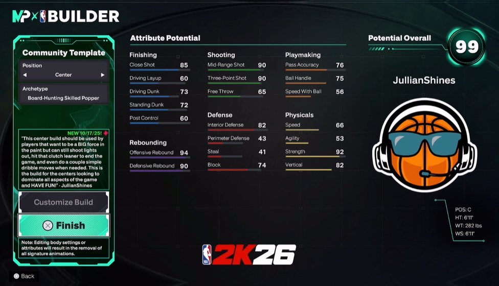 “This center build should be used by players that want to be a BIG force in the paint but can still shoot lights out, hit that clutch leaner to end the game, and even do a couple simple dribble moves when needed. This is the build for the centers looking to dominate all aspects of the game and HAVE FUN!” – JullianShines