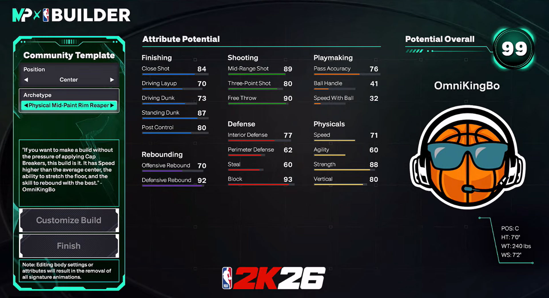 “If you want to make a build without the pressure of applying Cap Breakers, this build is it. It has Speed higher than the average center, the ability to stretch the floor, and the skill to rebound with the best.” – OmniKingBo