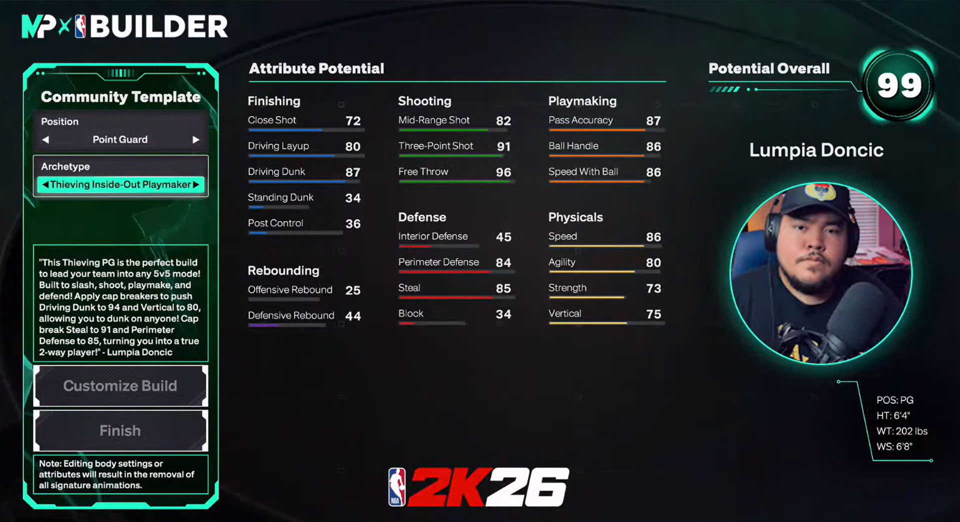 “This Thieving PG is the perfect build to lead your team into any 5V5 mode! Built to slash, shoot, playmake, and defend! Apply cap breakers to push Driving Dunk to 94 and Vertical to 86, allowing you to dunk on anyone! Cap break Steal to 91 and Perimeter Defense to 85, turning you into a true 2-way player!” – Lumpia Doncic