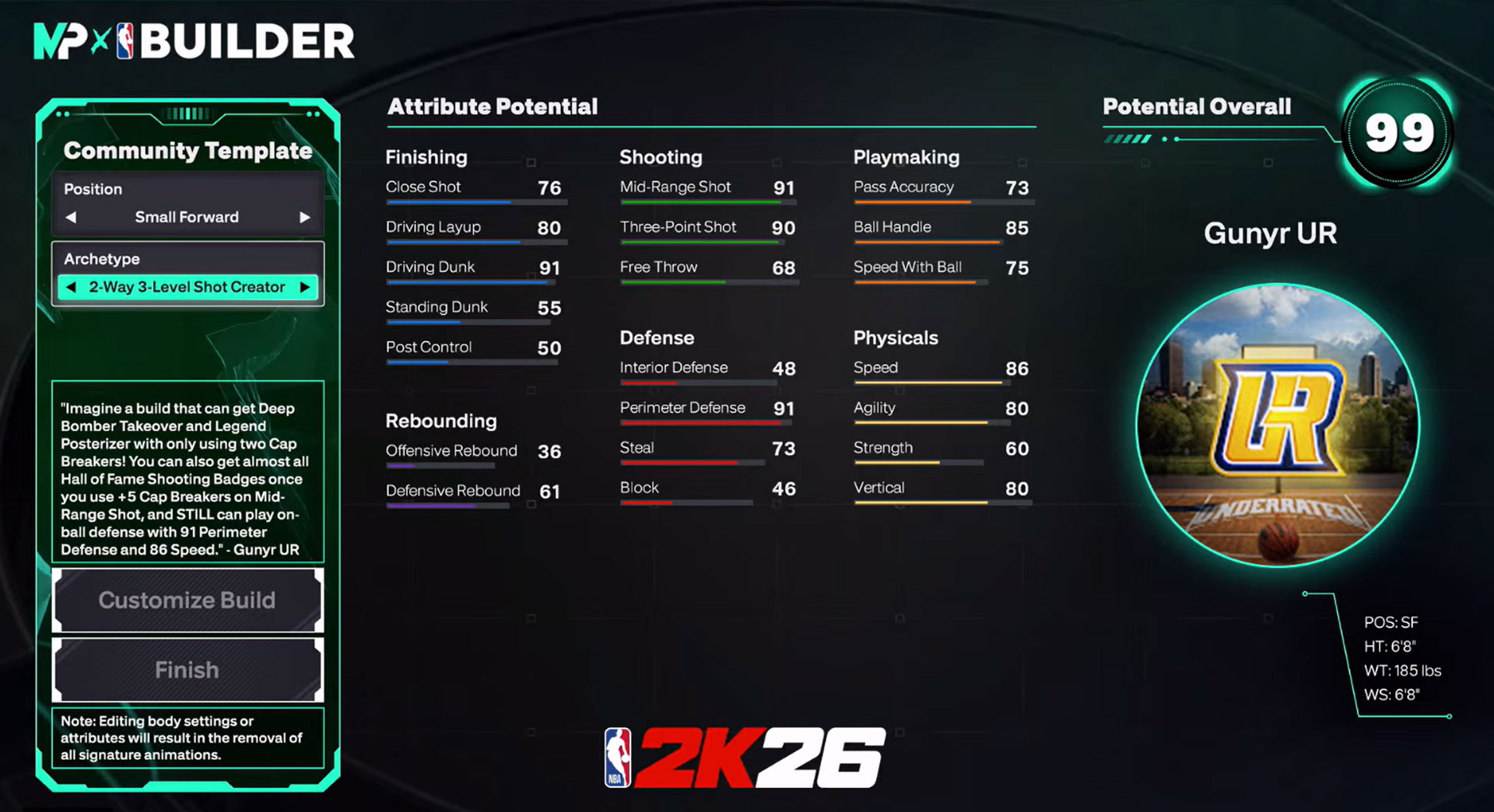 “Imagine a build that can get Deep Bomber Takeover and Legend Posterizer with only using two Cap Breakers! You can also get almost all Hall of Fame Shooting Badges once you use +5 Cap Breakers on Mid-Range Shot, and STILL can play on-ball defense with 91 Perimeter Defense and 86 Speed.” – Gunyr UR