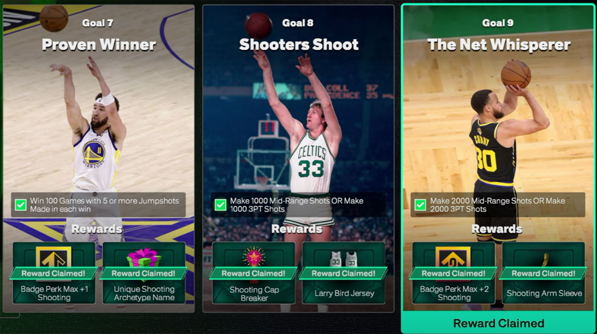 | 9 | The Net Whisperer | Make 2,000 Mid-Range Shots OR Make 2,000 3PT Shots | Badge Park Max +2 Shooting, Shooting Arm Sleeve |