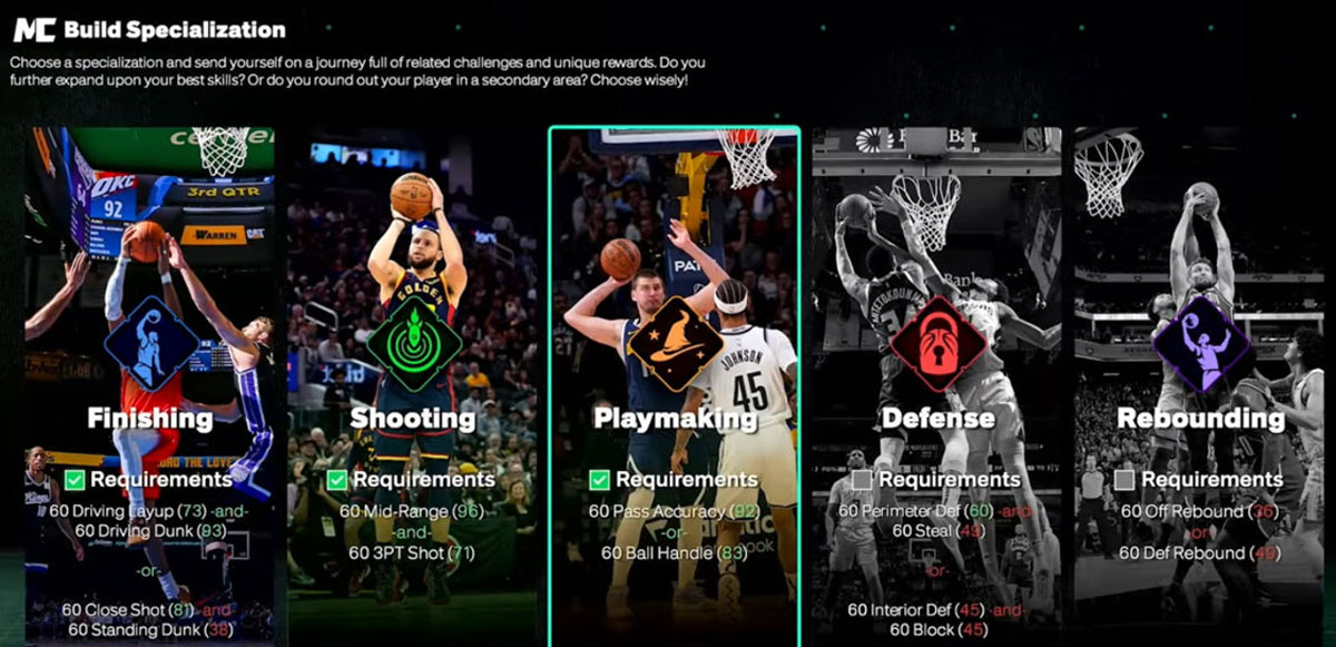 - For each save, you can choose 1 of 5 areas to specialize in: Finishing, Shooting, Playmaking, Defense, or Rebounding. Each area has 9 unique goals that test your abilities in that specialty.