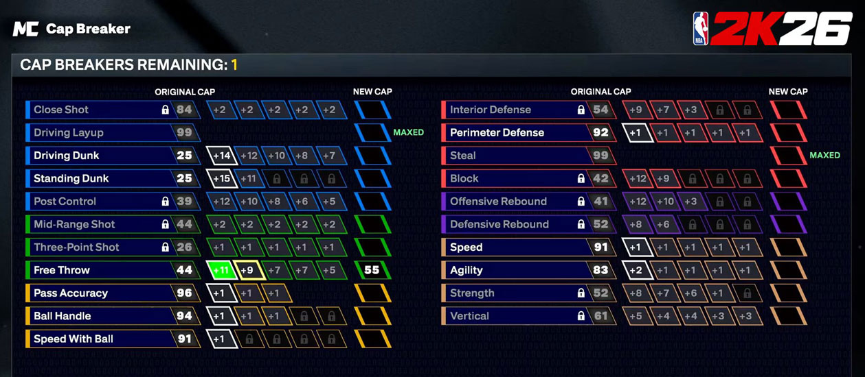 Cap Breakers in NBA 2K26 enable builds to exceed their original attribute limits, or “attribute caps,” with those ratings able to contribute towards Animation, Badge, and Takeover attribute requirements as well.