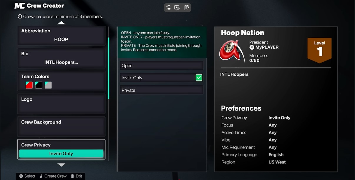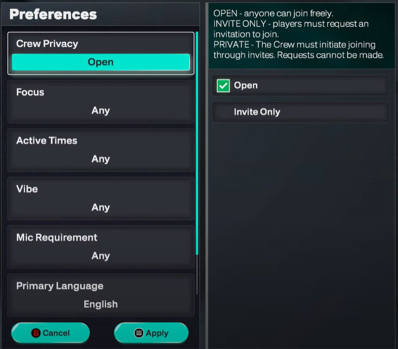 - Set your Crew Privacy preferences to either ‘Open’ or ‘Invite Only’