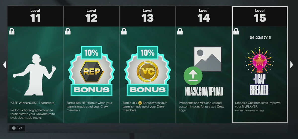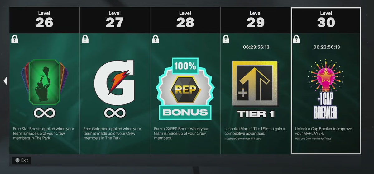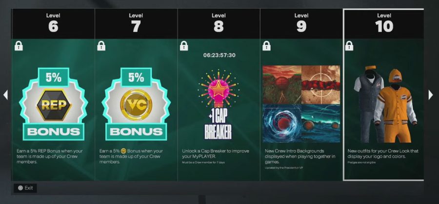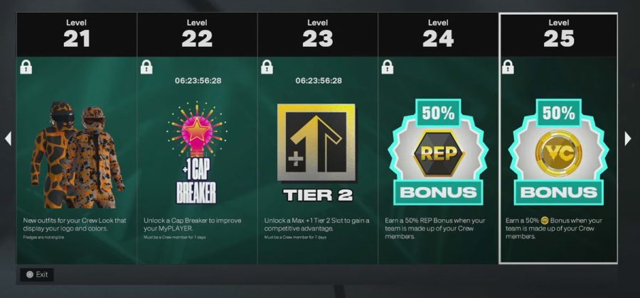 - Crews progress through 30 levels by playing games and completing weekly goals. Rewards include: custom branded clothing with uploaded crew logos, rep and VC bonuses, unlimited boosts, badge perks (such as a permanent +1), cap breakers, and more.