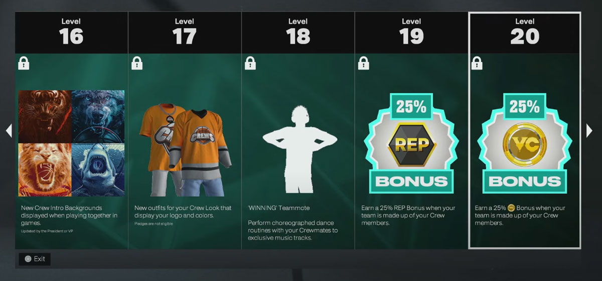| Level 20 | Earn a 25% VC Bonus when your team is made up of your Crew members. |