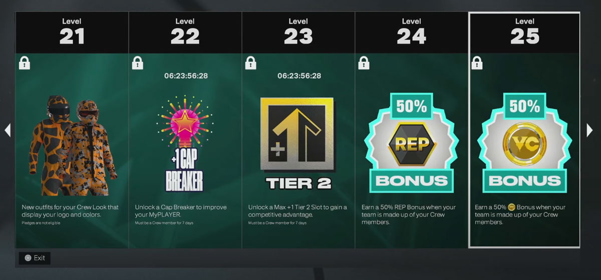 | Level 25 | Earn a 50% VC Bonus when your team is made up of your Crew members. |
