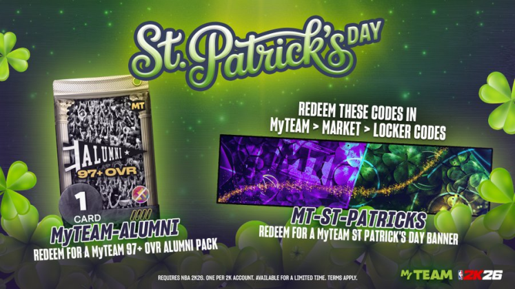 Here are the latest NBA 2K26 Locker Codes. The rewards are for Reward: Guaranteed 97+ OVR Alumni Player Pack, Certified Pack, and St. Patrick’s Day Player Banner