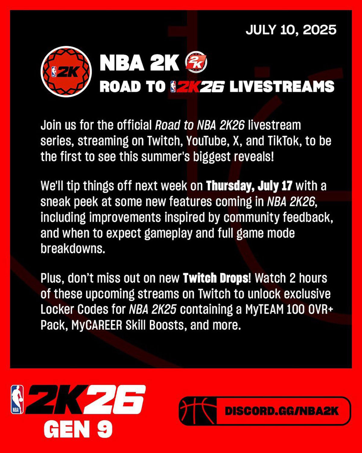 Tune in next Thursday, July 17, for the official ‘Road to NBA 2K26’ Livestream series to get a first look at new features, gameplay announcements, and how to get Twitch Drops Locker Codes.
